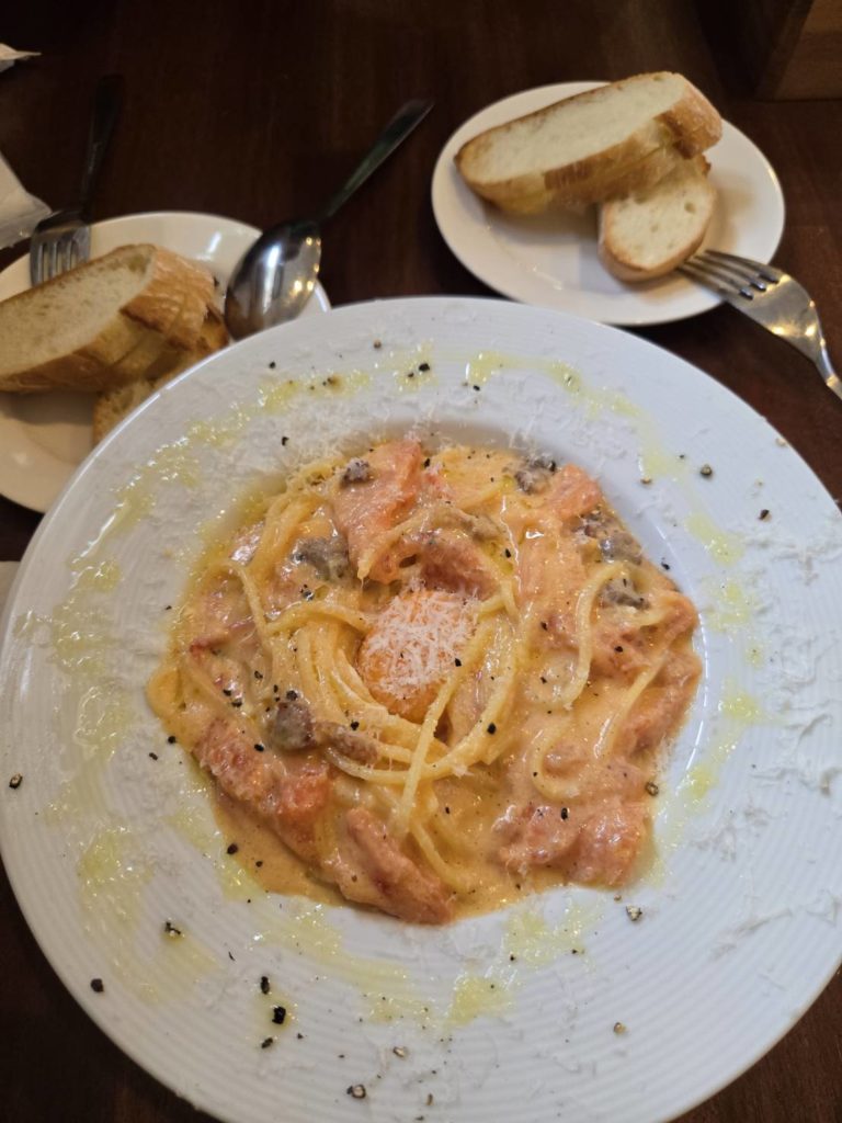 居酒屋 克朗さん ランチタイムはパスタやピザが食べれて 今月のパスタ🍝トマトカルボナーラ頂きました。 島人割のお店で20%も会計から割引でした~(^^♪